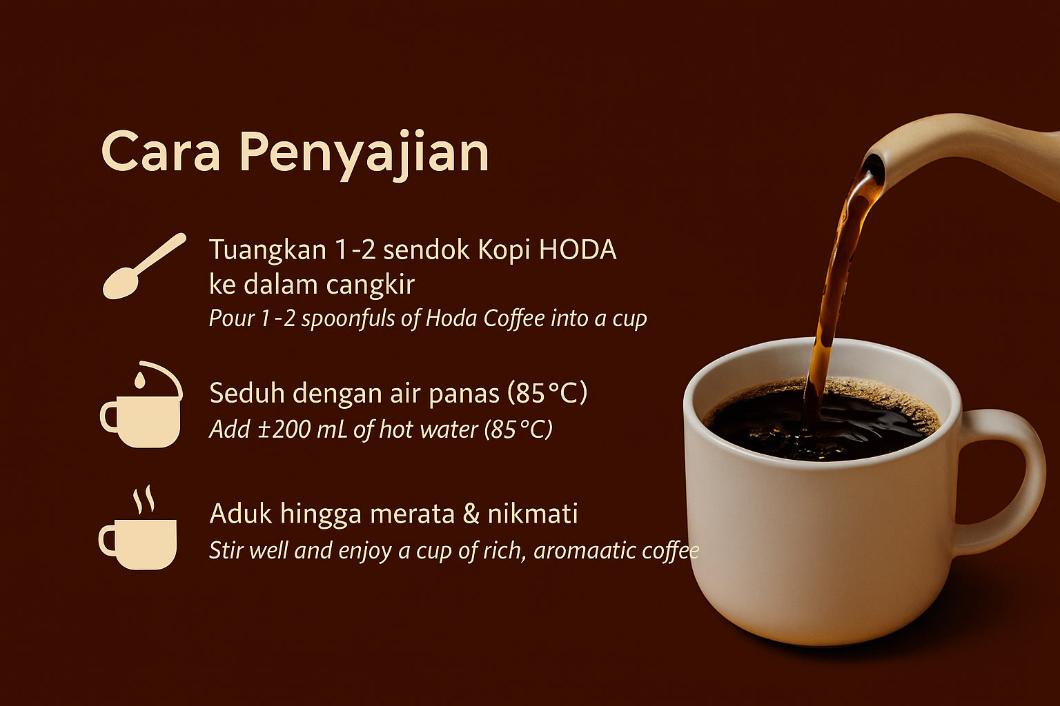 Diracik dari biji kopi pilihan warisan leluhur Nusantara. Setiap tegukan menghadirkan rasa kopi yang tebal, berkarakter, dan penuh cita rasa alami, seperti minum kopi asli dari tanah kelahiran para petani kita.